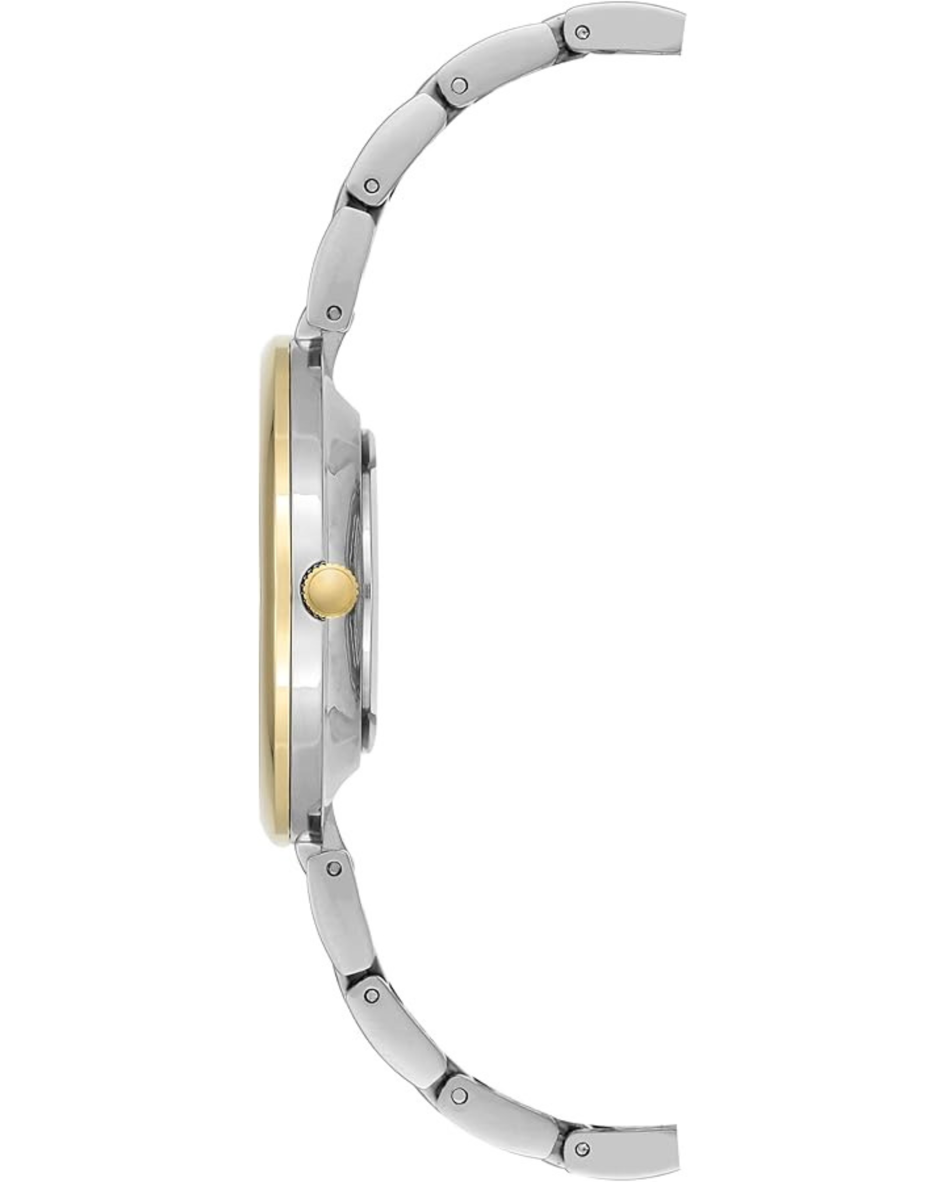 - Mineral crystal lens; silver-tone dial with gold-tone hands and markers