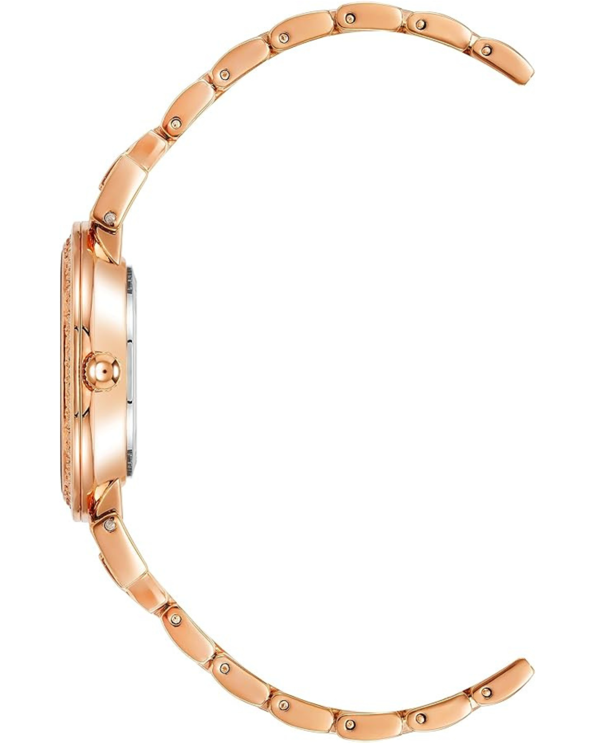 - Bezel set with 52 clear premium crystals; mineral crystal lens; navy blue sunray dial with rose gold-tone hands and roman numerals; silver-tone glitter filled markers